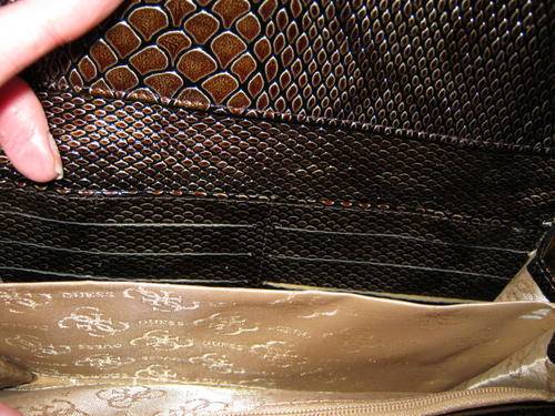 Exsquisite Guess ladies purse with wrist strap and detachable handbag strap. Stunning print with slight silver glitter outlining guess logo. Mock croc inside.