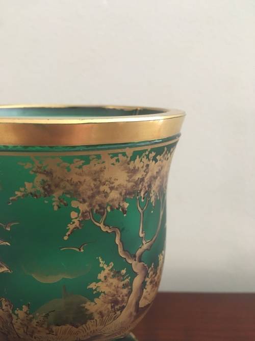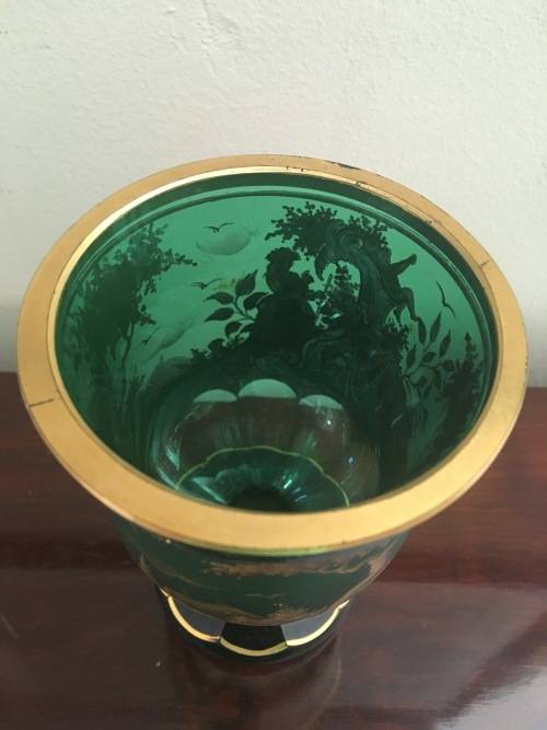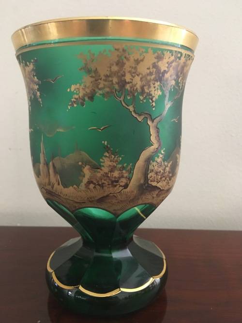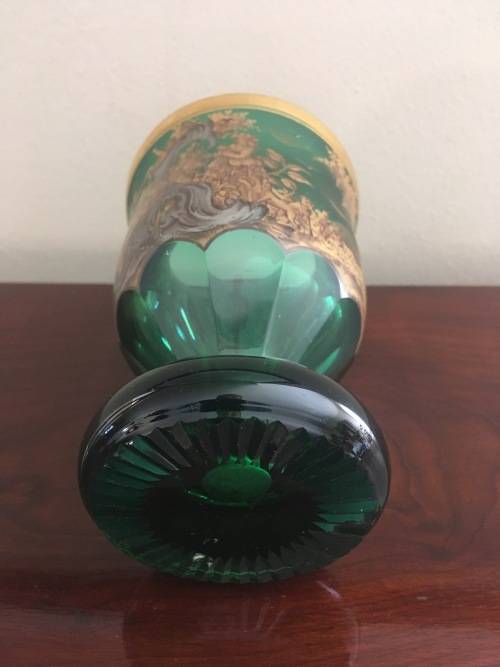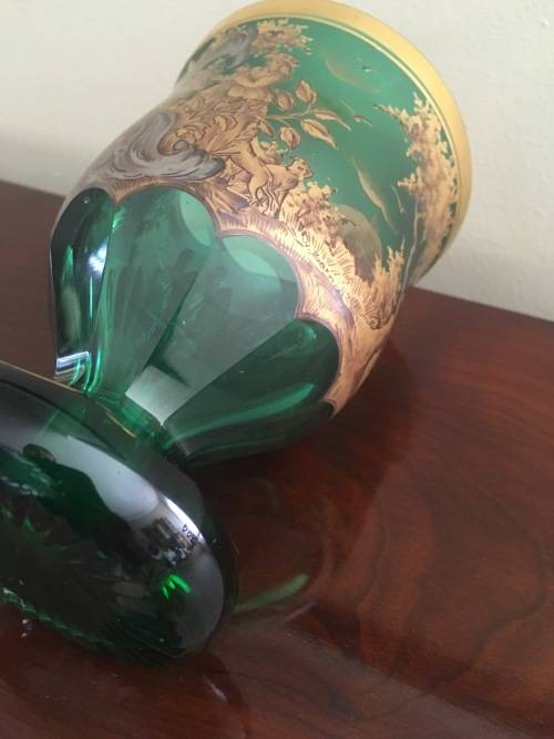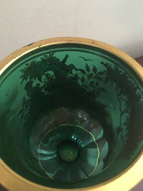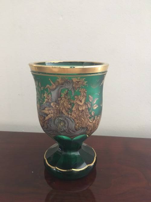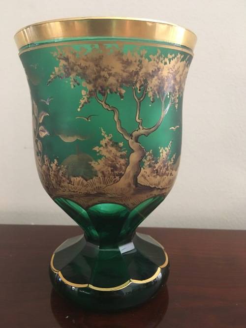 Stunning Hand Painted in Gold Scenes on 19th Century Green Crystal Goblet** Rare Piece**