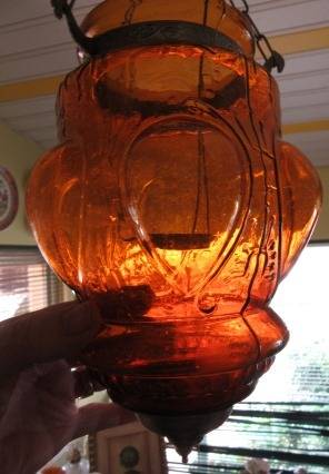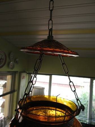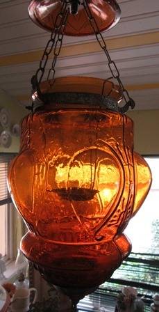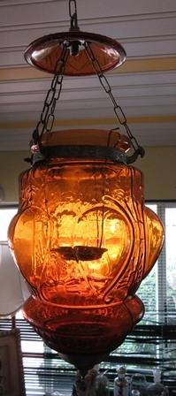 Stunning Amber Glass Hanging candel holder lantern in mint condition, the lantern is 70cm long x 40cm dia. Could easily be converted to electricity.