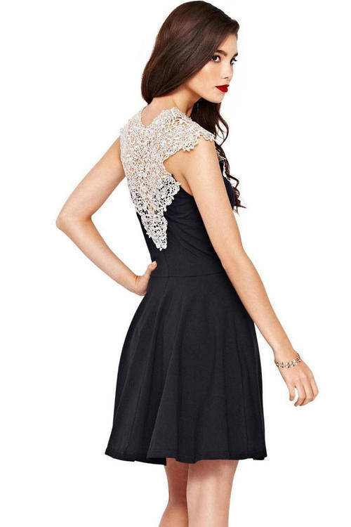 STUNNING HOLLOW OUT LACE CONTRAST NECKLINE DETAIL DRESS