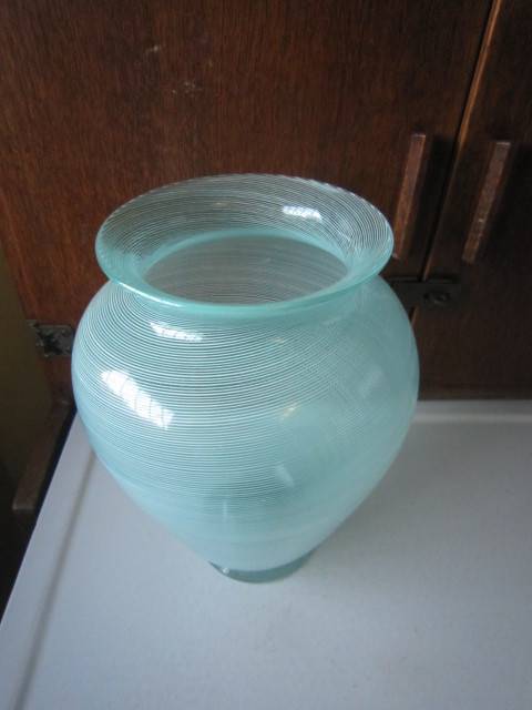 Wow, this is a really amazing hand blown swirl pattern art glass vase, it is huge and in brilliant condition except for a minute pin prick chip or fault on the very top, you can actually feel the lines on the outside of this vase. It is a stunning colour of aquamarine and white alternating lines right to the top of the vase then a see-thru base that looks aqua, this is a special piece and would look good as a centre piece with flowers on your dining room table. Size 31cms high by 22cms wide, postage will be 90.00 due to size and weight.