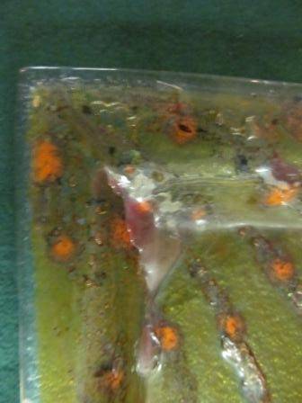 Here is a stunning glass tray from Italy. It is made from see-through yellow glass with air bubbles caught inside the yellow glass. To further enhance this glass tray, orange blob were spread, following the air bubbles' path. This is a one of a kind tray, it was made as a once-off by the craftsman, there are others like it, but no exact matches. The tray is in good condition, no chips or cracks.