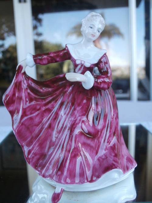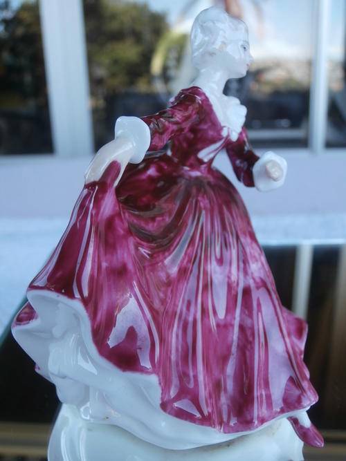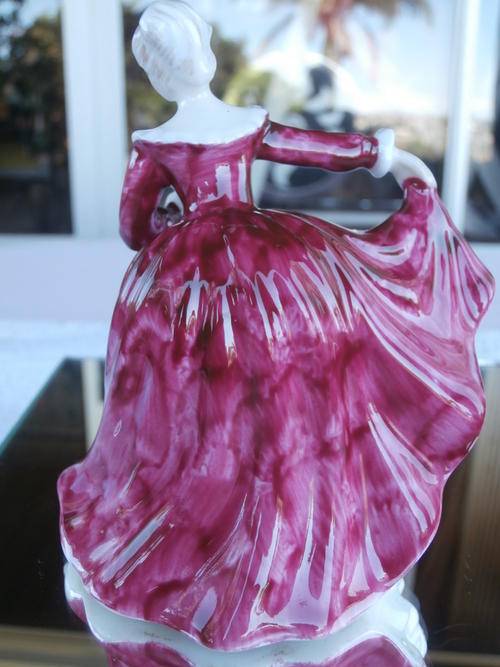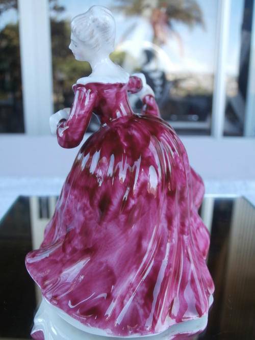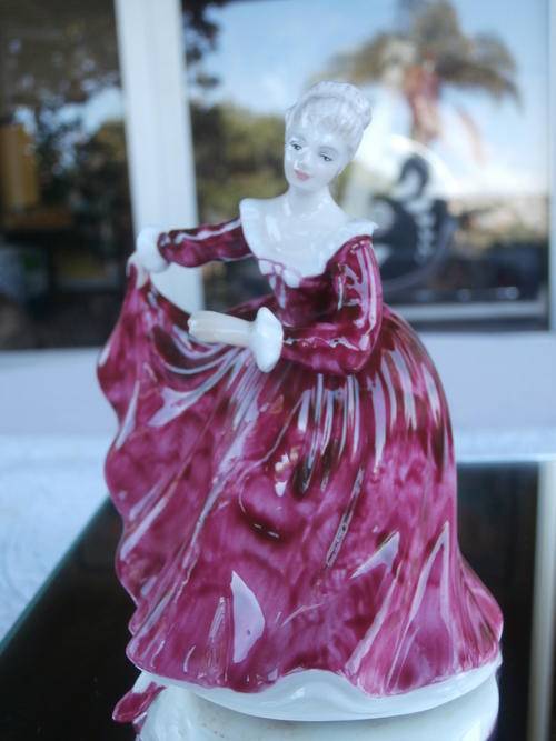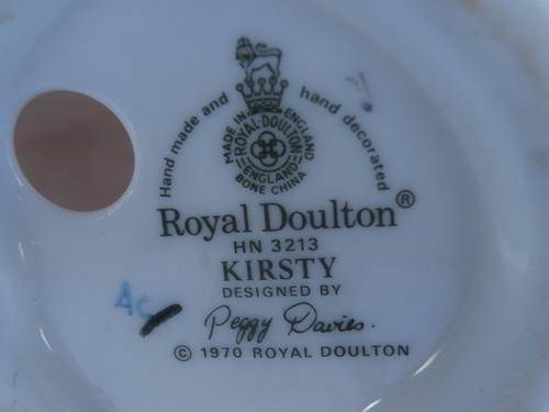 **KIRSTY**A DELIGHTFULL LADY FIGURINE BY ROYAL DOULTON DESIGNED BY PEGGY DAVIES. MADE IN ENGLAND.SIGNED BY THE WORLD RENOWNED PEGGY DAVIES SHE MEASURES 10CM HIGH. THIS CHARMING LADY IS DRESSES IN A STUNNING REDDISH PINK OUTFIT.