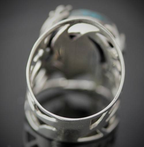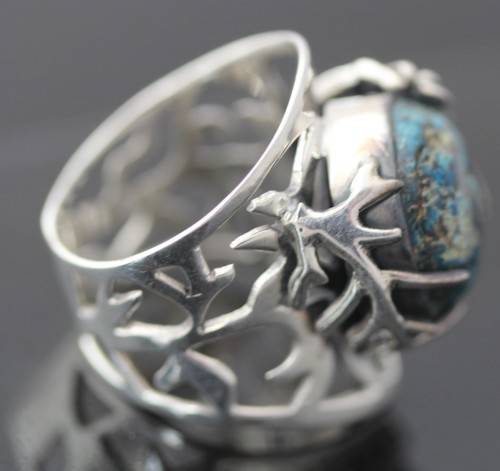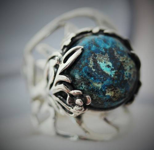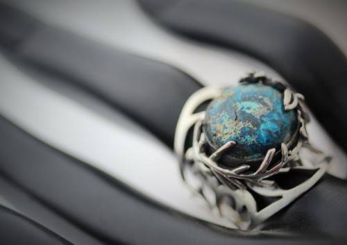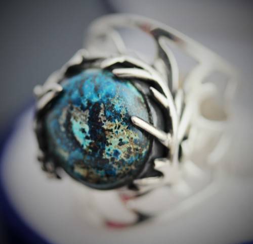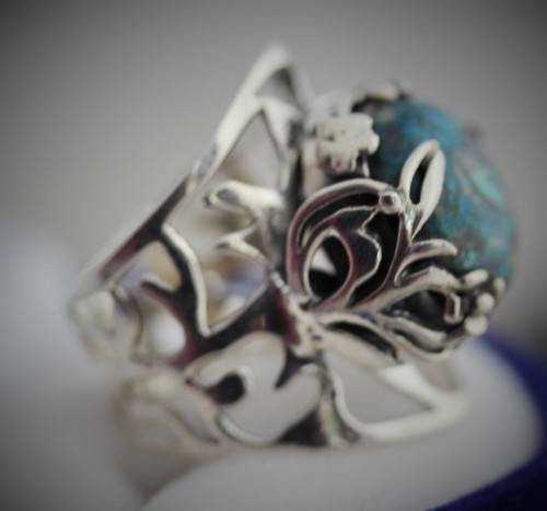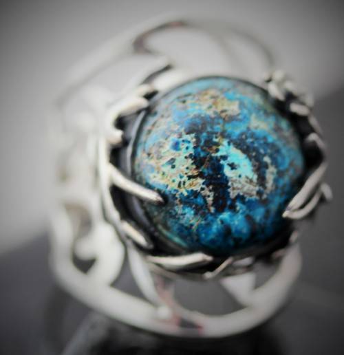 This striking ring features a rather unusual gemstone - a shattuckite. It is a big piece with a broad shank, set in sterling silver. The ring is bezel set with a 14mm round cabochon shattuckite gemstone. The whole design is very organic - the openwork wide shank is hand-crafted into a decorative tree branch detail all the way around, working its way to gently enveloping the gemstone with a flowing leaf-like frame. The ring head sits quite high, at 9 mm above the finger. Weighing in at 8 grams, it's a substantial piece of jewellery. Glorious on the hand, this organic piece is a stunner. Not an everyday piece!