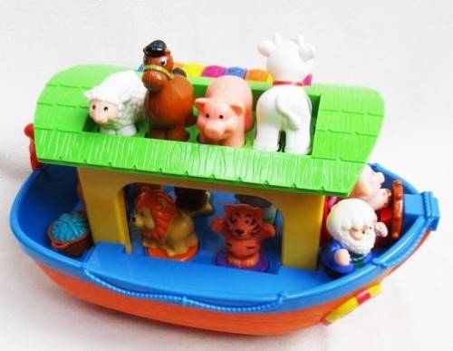 A LOVELY LARGE ARK - 21CM TALL X 33CM X 17CM WITH TEN ANIMALS, NOAH AND A KEYBOARD. HARD PLASTIC IN VERY GOOD, CLEAN CONDITION, IT TAKES TWO AA BATTERIES AND EACH ANIMAL FITS INTO A DIFFERENT SHAPED SLOT, THE LITTLE ONES CAN PLAY TUNES ON THE KEYBOARD, TURN THE SHIP'S WHEEL AND HEAR THE GLUG-GLUG OF THE ENGINE AND THE SHIP'S BELL RINGING, FIT EACH ANIMAL ON IT'S SPECIFIC SPOT AND WHEN THEY PRESS DOWN ON THE COW, PIG, HORSE, SHEEP, MONKEY AND GIRAFFE THEY WILL HEAR THE SOUNDS THEY MAKE. THE ELEPHANT, TIGER, LION AND PIG ARE SILENT. THE ARK IS ALSO ON WHEELS SO CAN BE PUSHED AROUND. NOT ONLY A FUN BUT AN EDUCATIONAL TOY. REFER IMAGES