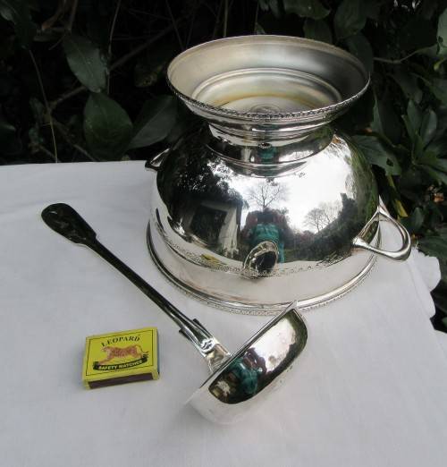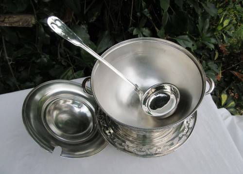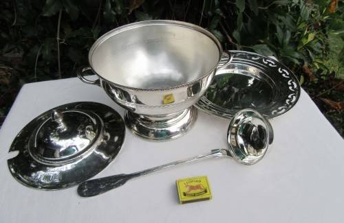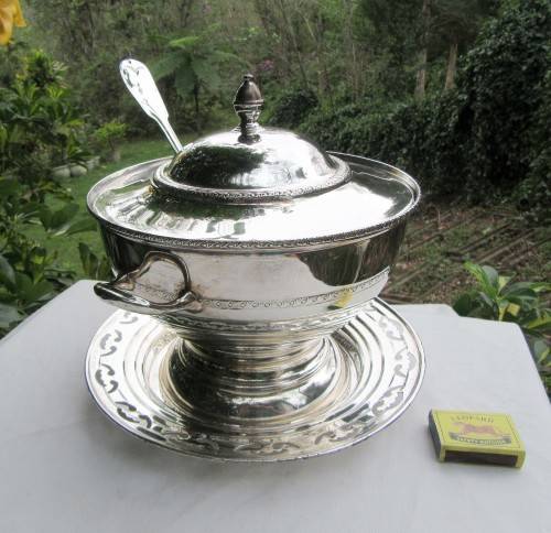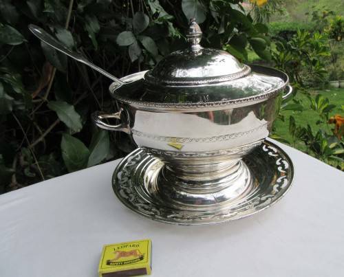 Silver Plated Soup Tureen by Seranco Silver on copper. Comes with a separate silver plated tray and a large soup ladle in brilliant good condition. All in great condition, only slight wear to lid of tureen (very slight).