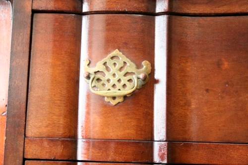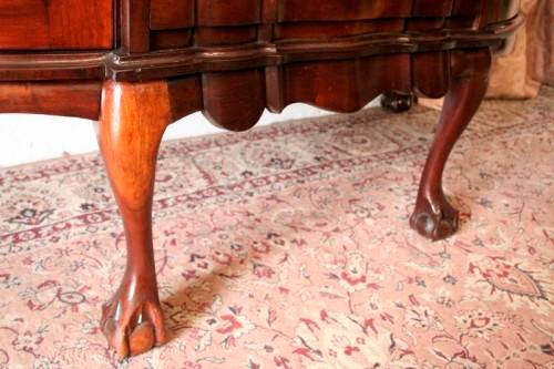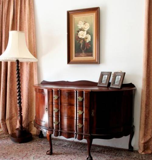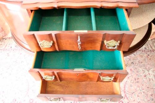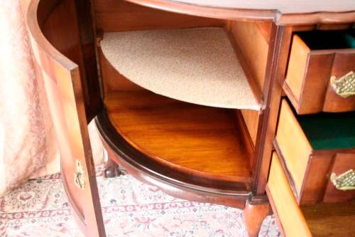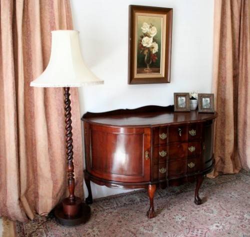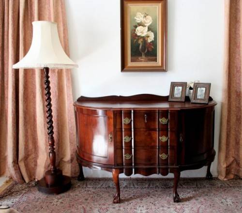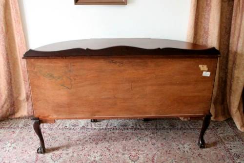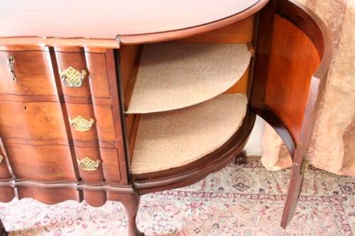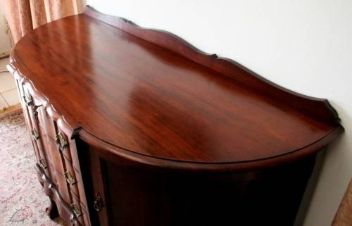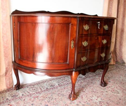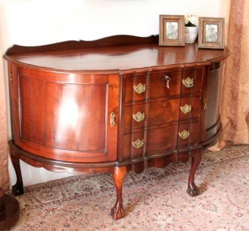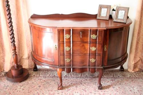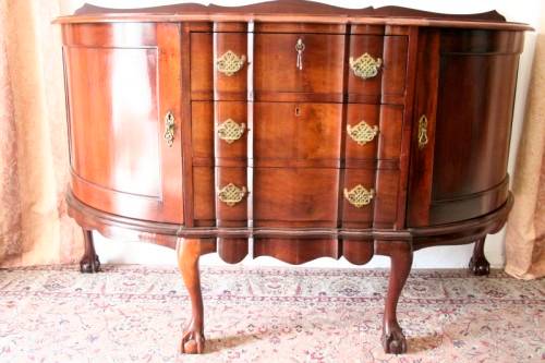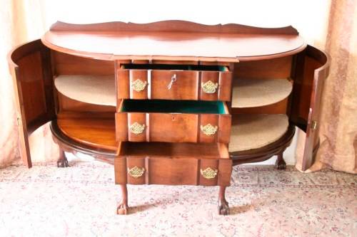 This stunning large vintage Imbuia ball ad claw buffet/ side server with three large drawers (the top drawer is a green felt lined cutlery drawer) and ample storage space for crockery, dinnerware and silverware measures a very decent 156cm long x 64cm wide x 99cm high. The server has beautiful detailing and finished with a cabriole ball and claw leg and stylish brass handles on the doors and drawers. The cupboards have a shelf, so they are ideal for dinnerware and would be great to store silverware and candles etc. There is minimal/ normal usage related wear. Please view the pics carefully to fully appreciate this stunning side server and to confirm the condition.