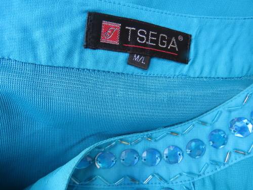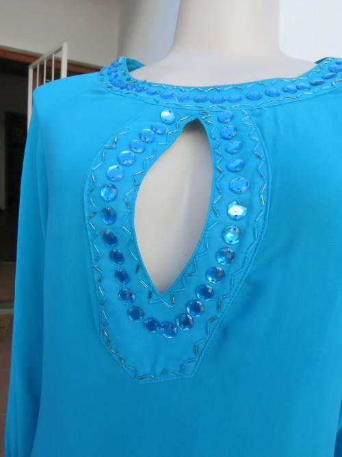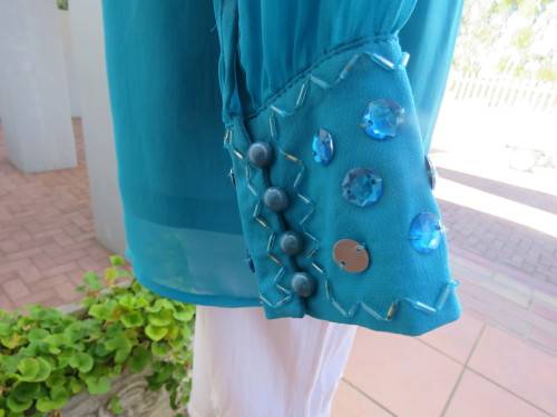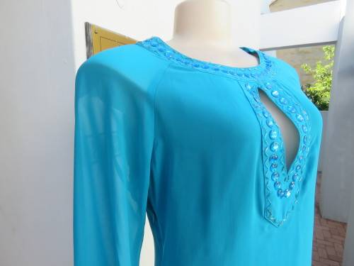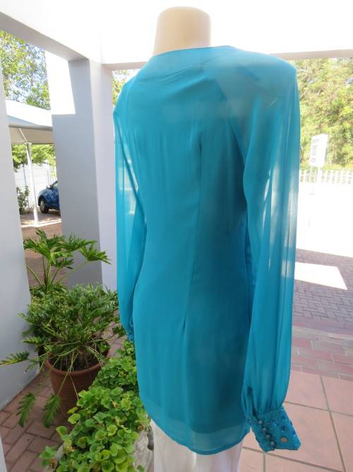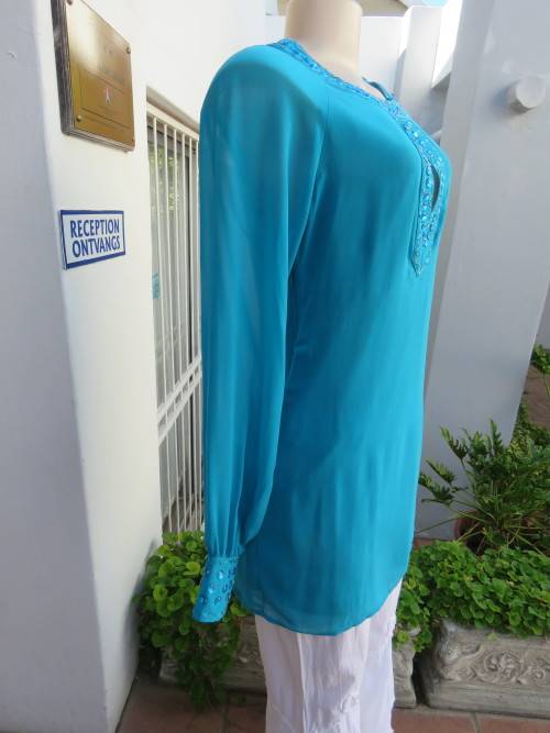 Stunning long sheer polyester top in turquoise .Fully lined.Size 34/10 by TSEGA.Long cuffed sleeves with embellishment.Rounded neckline and large peephole.Lots of embellishment.Suitable for day or evening wear.Zip at side.New condition.