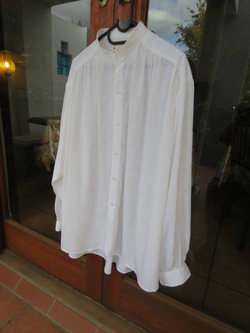Stunning men's silky polyester long sleeve chinese collar shirt with gathered yokes.Size XL.Wide gathered sleeves.In white for day or evening wear.Good condition by Stanley Mc Rael.