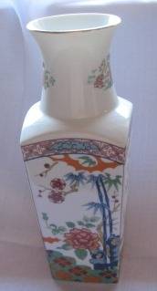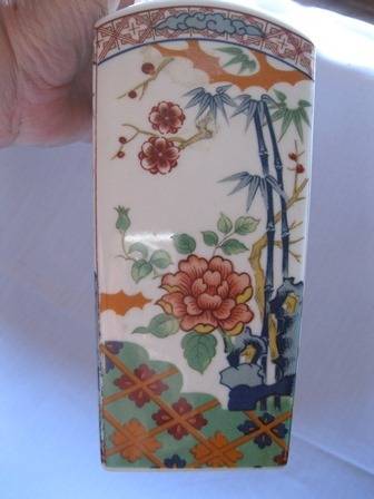This classic and elegant Imari vase was made in Japan by Miyako. The beautiful traditional design on this "handcrafted porcelain" vase includes rust,coral. green, blue,yellow flowers and bamboo, the same classic scene is repeated on all four sides of the vase, the neck includes multi colour flowers and 2 small elegant houses, the vase has a gold rim, which complements the gold accents on the four panels. The traditional shape trsitions from the squarebase of the vase to a round neck and rim.