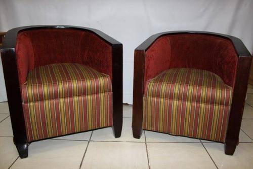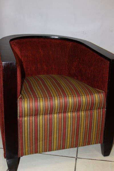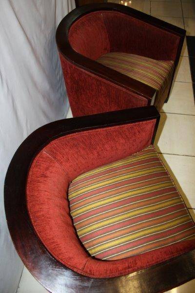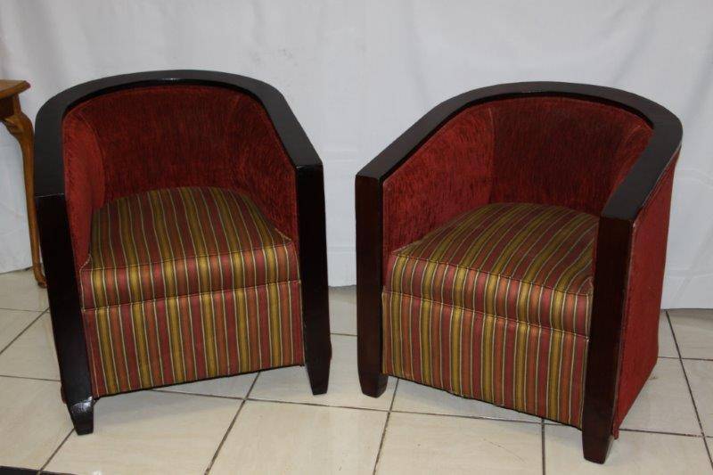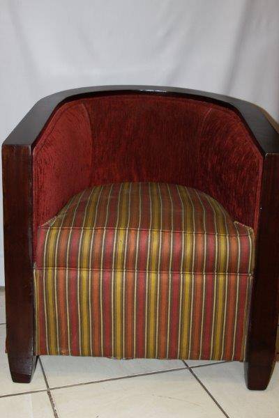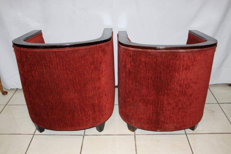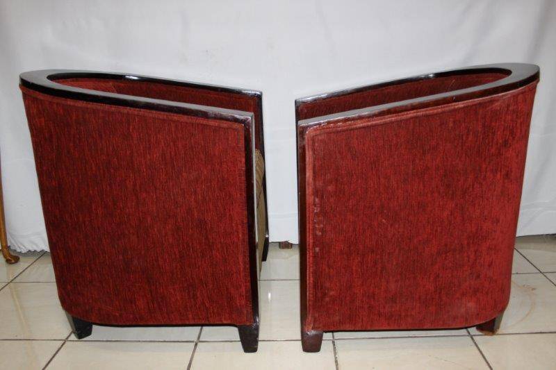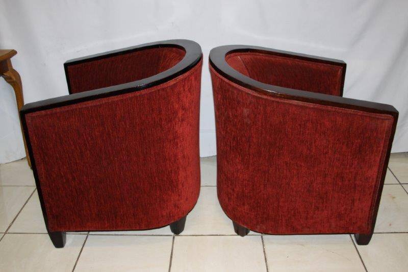 A PAIR OF EXQUISITE VINTAGE DEEP BURGANDY TUB CHAIRS, TOTALLY AWESOME AND EXTREMELY COMFORTABLE!!! THE SIMPLE DARK WOOD DETAIL ON THE CHAIR IS STUNNING AND THEY ARE BOTH VERY SOLID ON THE GROUND, AND REALLY SERIOUSLY VERY COMFORTABLE!!! THE CHAIRS COULD POSSIBLY DO WITH NEW UPHOLSTERY, HOWEVER THEY ARE MORE THAN ACCEPTABLE THE WAY THEY ARE! PLEASE VIEW THE PICS CAREFULLY FOR MORE DETAIL AND CONDITION - WHAT YOU SEE IS WHAT YOU GET AND THERE IS SOME WEAR AT THE BOTTOM OF ONE CHAIR! THE CHAIR IS APPROXIMATELY 700mm x 700mm x 750mm HIGH. POSTAGE AND PACKAGING WILL NOT BE POSSIBLE SO PLEASE ARRANGE FOR COLLECTION IN EDENVALE FREE OF CHARGE!