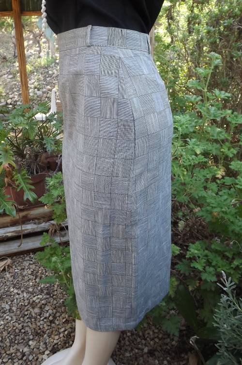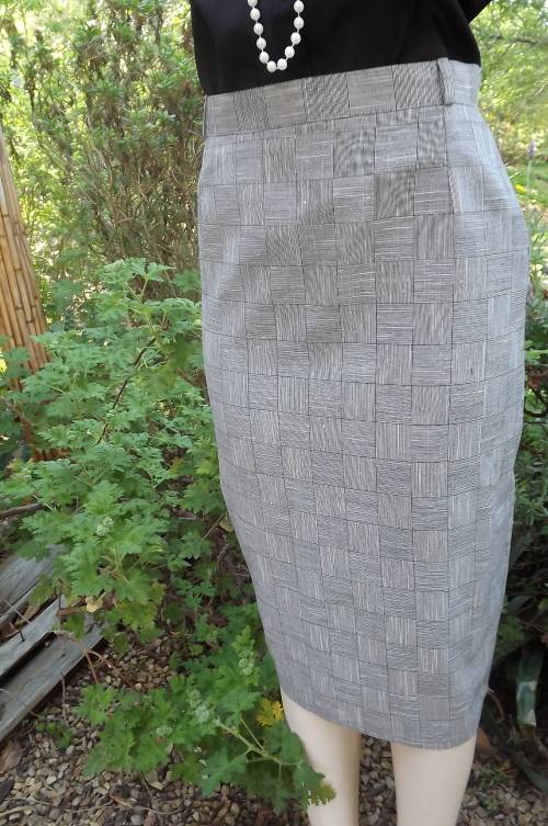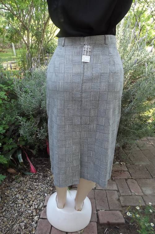 Monochrome checkered calve length pencil skirt in size 34/10. Tailored for a good fit. Suitable for winter and summer.