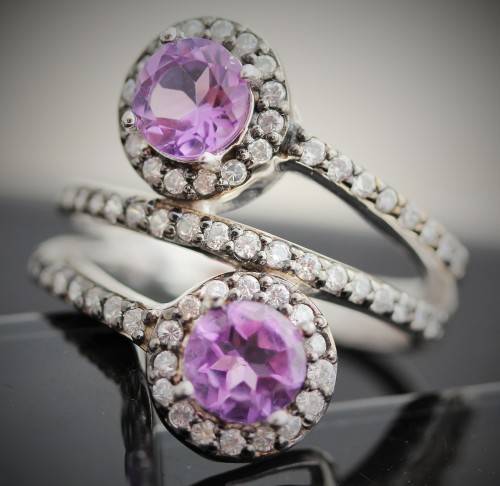 This beautiful richly coloured modern ring features two amethyst gemstones, framed by white round cut sparkly stones, set in sterling silver. The ring head is divided into three separate strands - the middle one wraps all the way around the finger, and the outer two finish with a four claw set round Portuguese cut amethyst on each end. The amethysts are natural unheated Brazilian-mined 'AAA' quality gemstones and total just over a full carat. Each strand of the shank is decorated with tiny round cut claw set white stones, as well as down the shoulders and around the amethysts. The ring head sits 6mm high above the finger. It is large without being over the top at 23mm each way. A real conversation piece of a ring, it is full of character and life!
