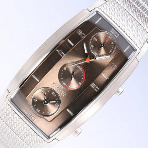 This mens dual time watch features a shine brown dial with chrome indicators and second hand.