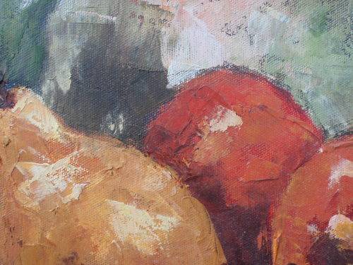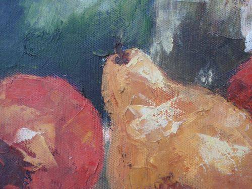STUNNING ORIGINAL OIL ON CANVAS (ON STRETCHER FRAME, READY TO HANG) 'AUTUMN FRUIT WITH GREEN JUG' LOVELY PALETTE KNIFE FINISH - RICH COLOURS! SIZE: 25CM X 25CM X 2.5CM.
