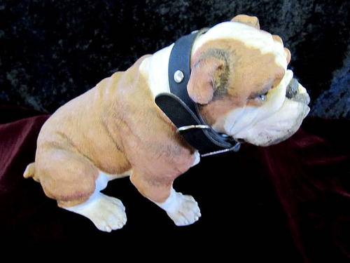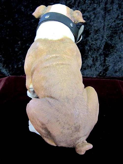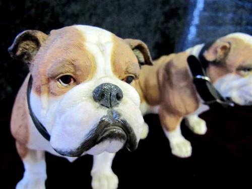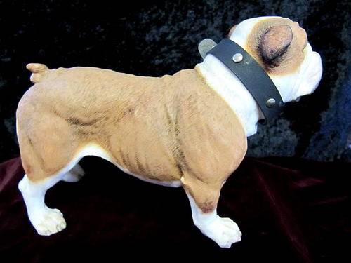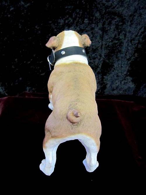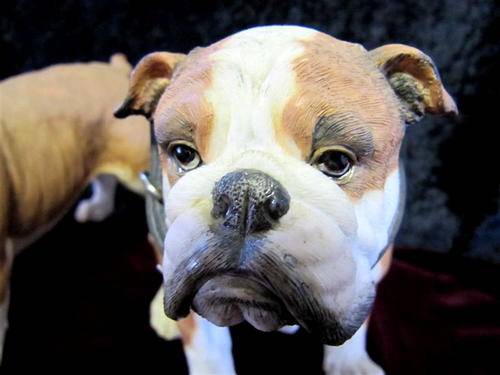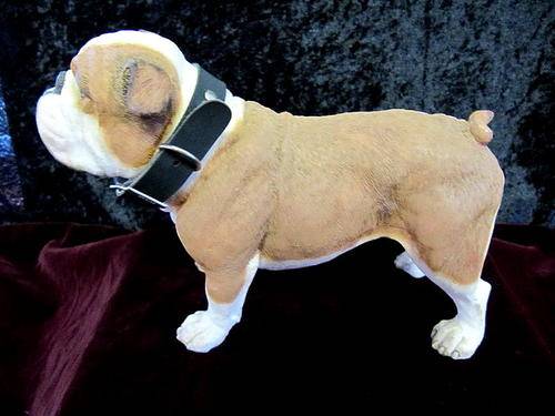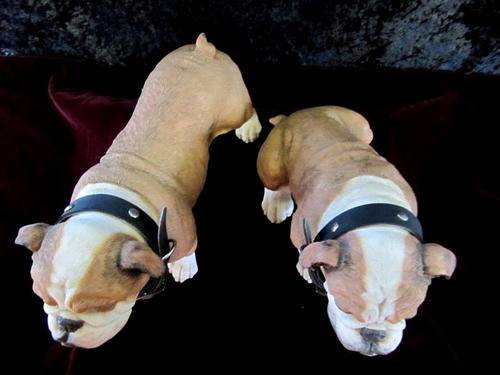 Your bid is for the pair! Lovely moulded bulldog figures made from a hard white resin-type material and hand-painted with magnificent life-like detail, these two figures stand tall at dimensions of approximately 20 cm in length and stands 14 cm in height each.