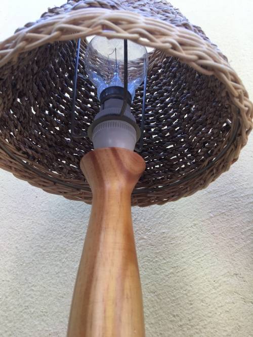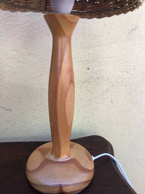 A STUNNING PAIR OF PINE BEDSIDE LAMPS WITH WICKER SHADES , PERFECT FOR A SPARE BEDROOM OR COTTAGE