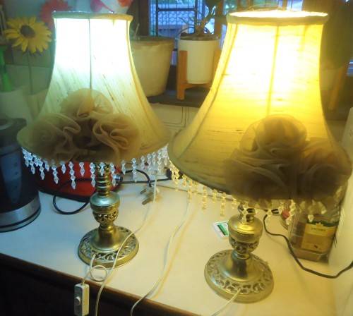 STUNNING PAIR OF SOLID BRASS LAMP STANDS WITH RETRO CREAM WITH ROSE & DIAMANTE TRIM SHADES