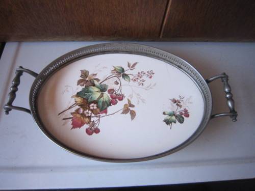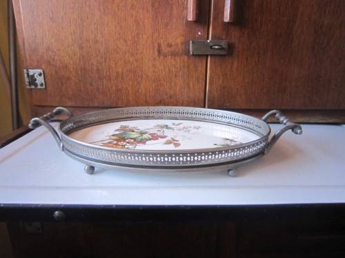 Wow, this is a stunning porcelain and silver plated tray to put proudly in your kitchen, there is a short hairline crack but it does not go right through the porcelain, other than that is in lovely clean condition. The surround of the tray is brilliantly crafted and it has 4 bun feet. I have not shined up the silver plate as I thought it looked lovely as it was but I am sure it would shine up nicely The porcelain is marked 1 N on the side and 85 in the middle, other than those marking I can't find any others. The decoration seem to be a transfer print which has been painted over. 39cms long, 23cms wide and 5cms high, postage will be 85.00.