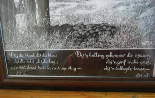 46CM X 35CM WITH FRAME AND PRINT IS 39CM X 28CM IN VERY GOOD CONDITION. A VERY STRIKING DEPICTION OF THE POEM "DIS DIE BLOND, DIS DIE BLOU" REFER IMAGES PLEASE DISREGARD REFLECTION OF LIGHT OFF GLASS.