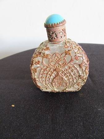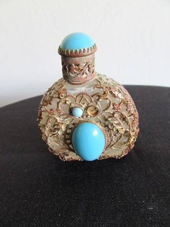 Stunning Rare Chezech Perfume bottle with filagree decoration on the bottle as well as the lid, glass stoppper still intact with turqoise stoneson the front of the bottle and lid, one stone is missing from the front of the bottle however can be expected with age.C1930