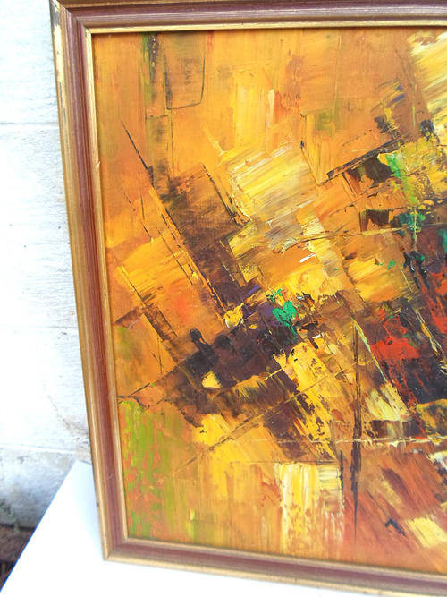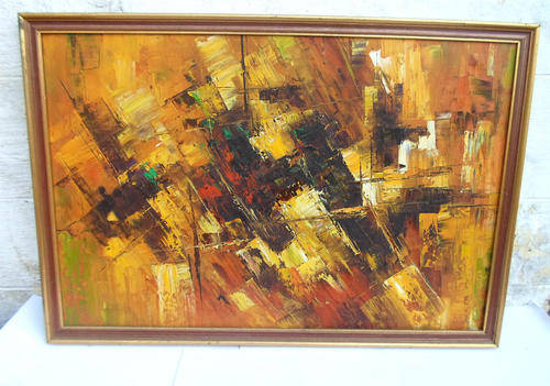 Large Original SA Framed Oil or Acrylic type Painting on canvas, depicting 1960s Johannesburg Sky-Line. Sorry the owner did mention who the artist was, but it was a long time ago and I have forgotten. The painting is signed, but the name is indistinct. Included with the painting is a Dramatic, Highly Decorative, Modernistic, Appealing Mid Century 1960s Retro era, Large ceramic Bison (Bull) Figure, not marked, but probably European, Italian German? Well proportioned Stylised stance. Possibly had a paper label which dropped off. Typical 60s mottled glaze and period orange colour way. No damages noticed, odd rough spot to feet, but no chips, cracks or noticeable repairs., ideal for the retro Inspired Home décor. Both items portray Typical Oranges fashionable in the 60s.