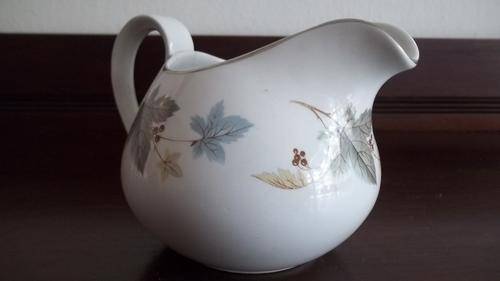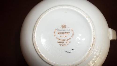 THIS STUNNING RIDGEWAY OF ENGLAND MILK JUG IN THE EXQUISITE WHITE MIST SERIES HAS THE VERY BEAUTIFUL VINEWOOD PATTERN AROUND IT. THE MILK JUG HAS BEEN BEAUTIFULLY FINISHED WITH SILVER GILDING AROUND THE RIM. THERE ARE NO CHIPS OR CRACKS IN THIS AMAZING JUG. THE MILK JUG IS 7.5cm TALL.