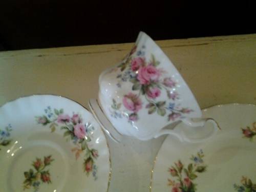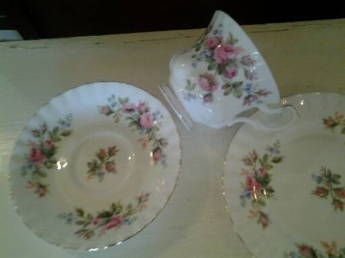 beautiful Royal albert moss ross tea cup trio , there is a very slight bit of wear on the gold but in the hole items are in good used condition , I have six of the same will list separate on my site