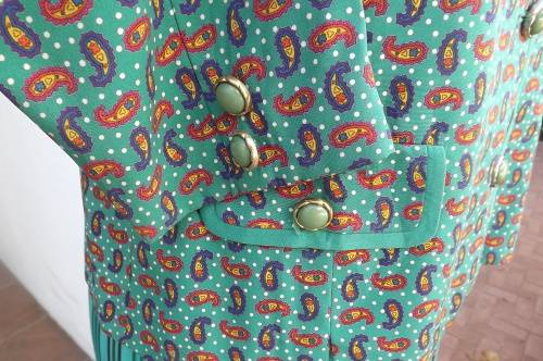 Stunning seagreen collarless short jacket.Size 38/14.Polyester fabric with paisley pattern in purple and brick with white polkadots in between.Two pockets on front.Button down with seagreen piping all around.New condition.Made in Korea.