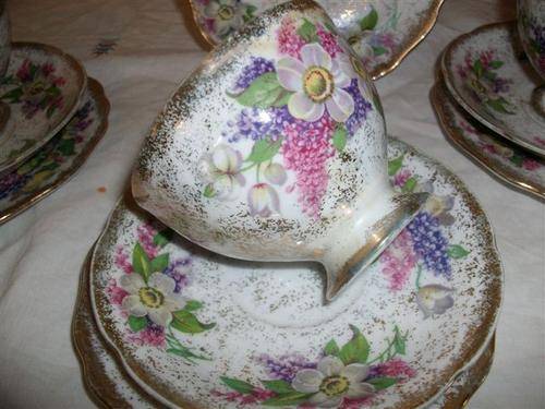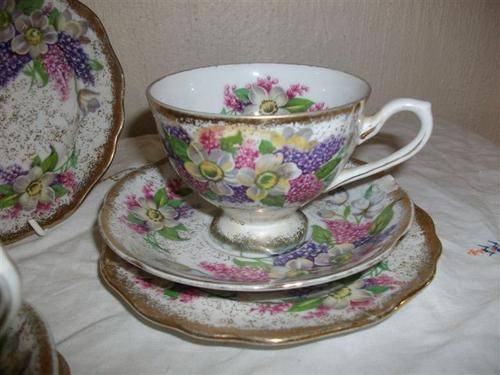 Very lovely floral pattern set of five trio's and one extra side plate with this one , this is one side plate with a chip on the edge of the front side of this set other items are in good condition markers deodora fine china hand painted , hole lot as per pictures for one bidplease note to pack this up will be R60 please