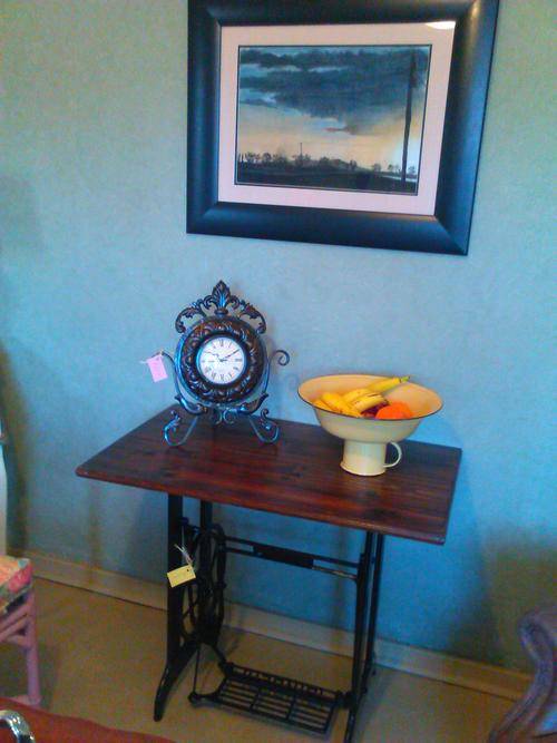 A stunning table crafted from an old sewing machine pedestal. Wooden top. Foot painted black, but colour can be changed to suit your décor.