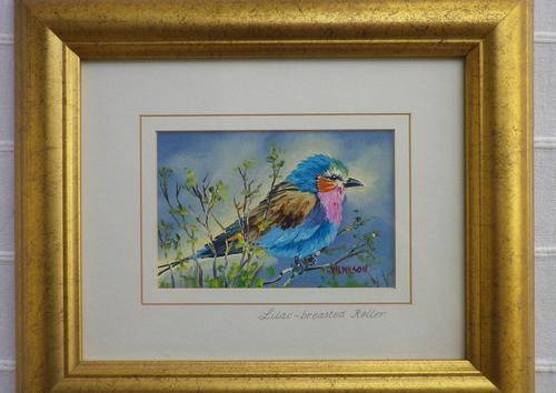STUNNING SMALL OIL PAINTING OF A LILAC CRESTED ROLLER IN LOVELY GOLD FRAME. VERY SPECIAL!