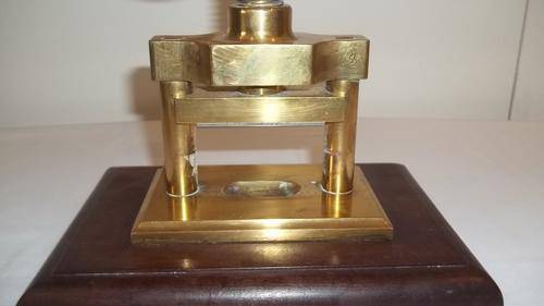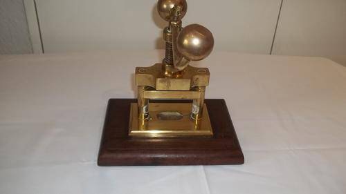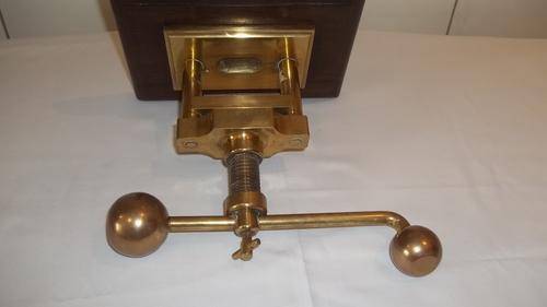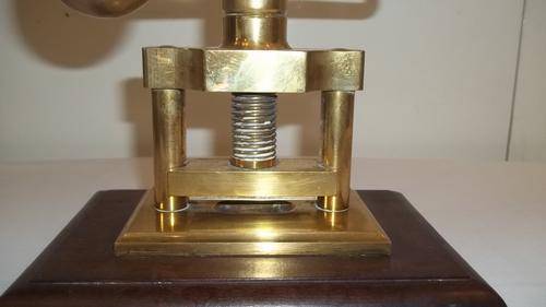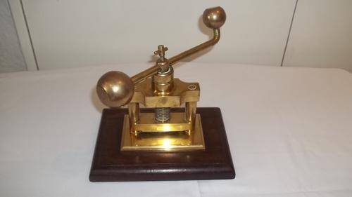 THIS IS ONE OF THE MOST AWESOME NUT CRACKERS I HAVE EVER COME ACROSS. THE SOLID BRASS MECHANISM IS MOUNTED ON A WOODEN BASE. THE LEVER IS ROTATED TO ALLOW JUST THE RIGHT AMOUNT OF PRESSURE ON THE NUT WITHOUT CRUSHING IT INTO OBLIVION AS SO OFTEN HAPPENS WITH NUT CRUSHERS. THE JAWS CAN EXPAND TO TAKE BIG NUTS TOO. THIS IS A TRULY STUNNING PIECE.