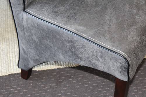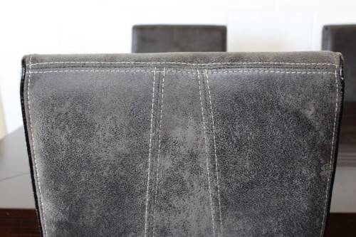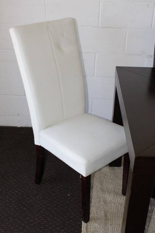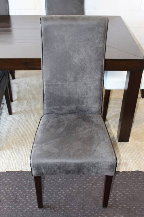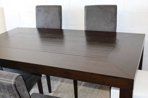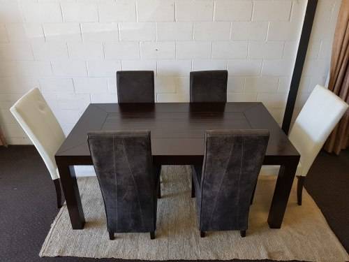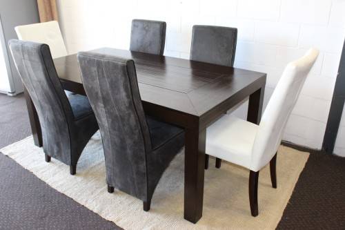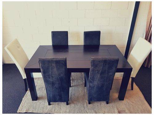 This stunningly styled teak dining table has four awesome grey suede feel upholstered and two white leather feel upholstered high-back dining chairs chairs and is in great condition. This stylish modern design makes it ideal for a vibey apartment and the ideal six seater dining room suite for a townhouse or flat or even on a covered patio. The table could accommodate eight chairs if needed. The table is 180cm long x 100cm wide x 76cm high and the chairs are 48cm long x 60cm wide/ deep x 105cm high. Please view the pics carefully to fully appreciate this stunning dining suite and to confirm the condition.