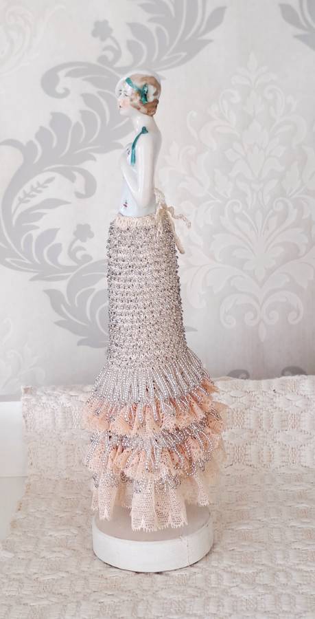 Exquisite half body h/painted porcelain lady with hand beaded and and crocheted skirt one of a kind. the fine crocheting and exquisite bead work makes this a master piece. The skirt is double layered beaded. definatley one of a kind. The porcelain top is hand painted with beautiful detail.