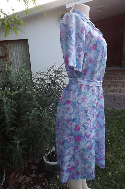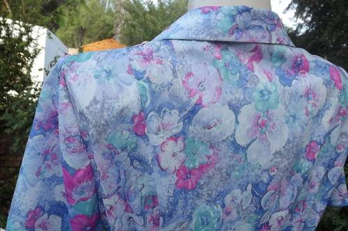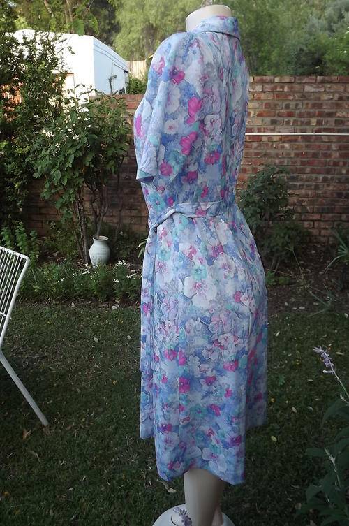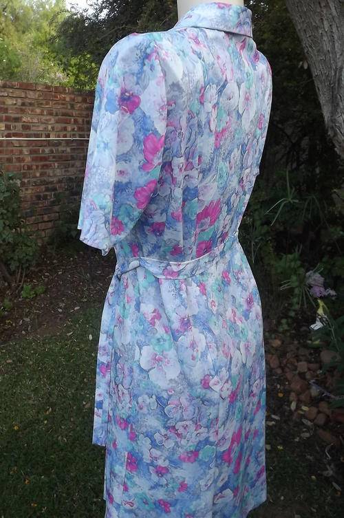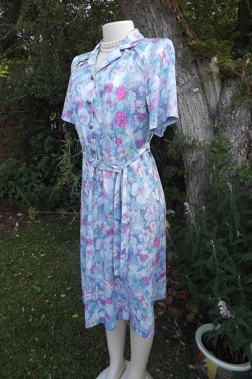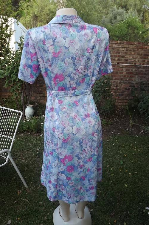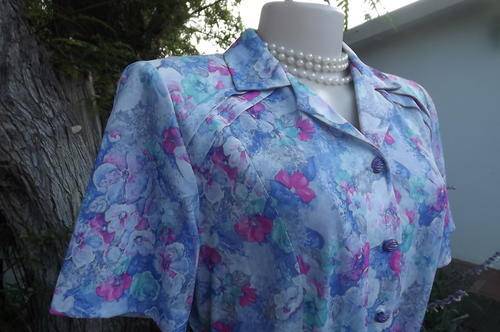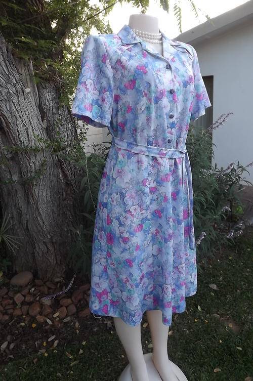 Stunning tastefully printed blue & pink floral princess style. Nuvele by Rosecraft dress. Size 38/14. Horizontally tucked seems on front shoulders. Button down to middle. Amazingly good condition