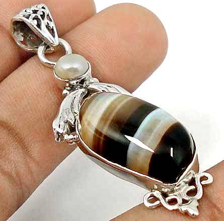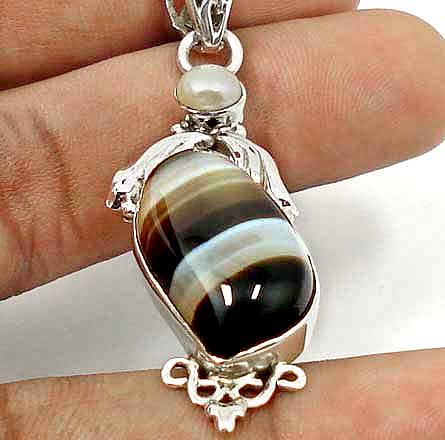 STUNNING! TOFFEE BOTSWANA AGATE AND PEARL STERLING SILVER PENDANT!