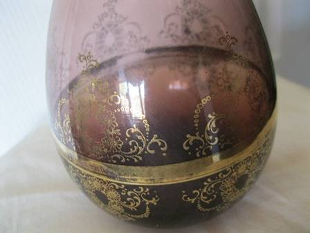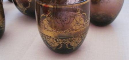 You are bidding on a stunning Venetian Carafe in a deep plum and gold with 7 matching glasses all in tact with no chips or cracks some wear on the gold however can be expected from age.