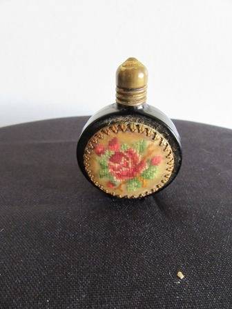 Stunning Vintage Austrian perfume minature black perfume bottle Viennese Petit Point, round shaped C 1930. 5cm x 3cm.