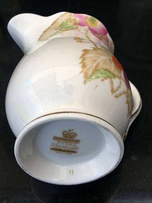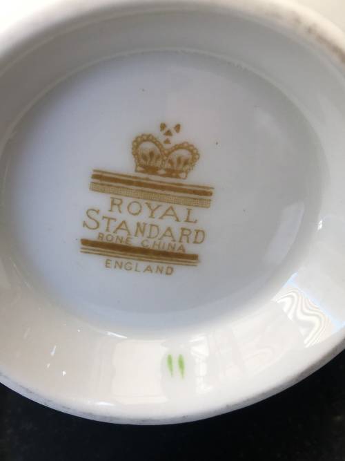 “Royal Standard” was a trademark used on English china made by a potteries company called Chapmans Longton Ltd. This company was among the famous Staffordshire pottery companies, and based at Albert Works, Longton, Stoke-on-Trent. Longton was a center of pottery making from the mid-1700s.Chapmans Longton Ltd., had three known manufacturers’ trademarks. “Standard China” was one of them, used between around 1916 and 1930. “Royal Mayfair” was another trademark, used to identify the company’s bone china during the period from about 1938 to 1941. “Royal Standard” was perhaps the company’s best known trademark, in use from about 1949