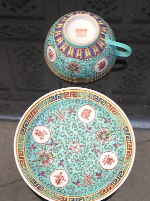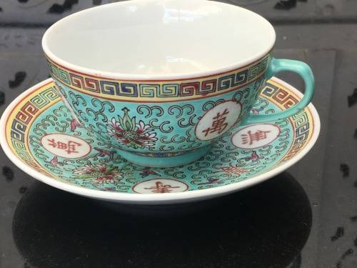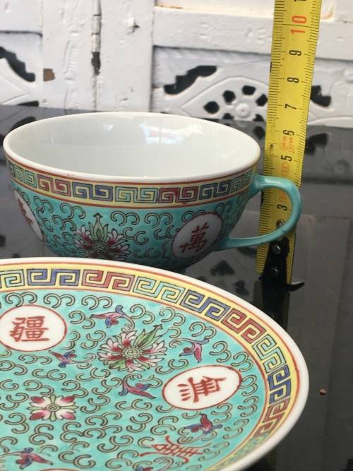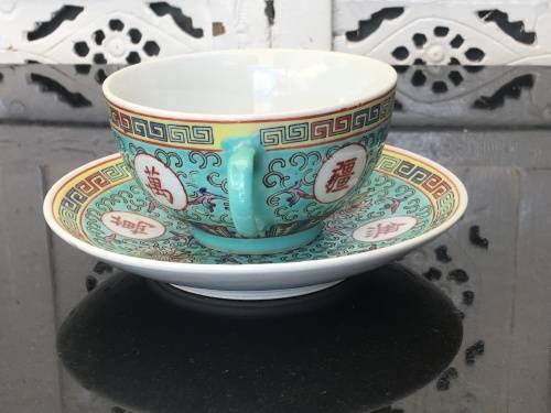 Green Enamel Hand Painted Large Tea Cup & Saucer.