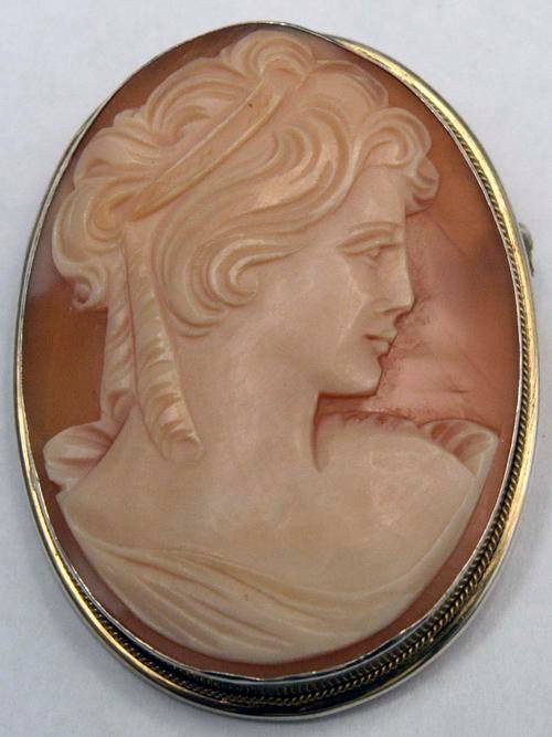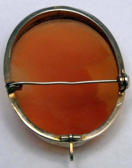 A stunning vintage handcarved shell cameo brooch, which also has a loop to transform it into a pendant. In good condition, but there is some age cracking on the background of the cameo (see pictures). The frame is made of 800 silver (stamped) with a gilt finish to it. Length, 45mm.