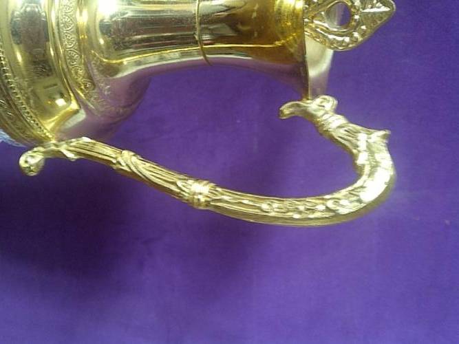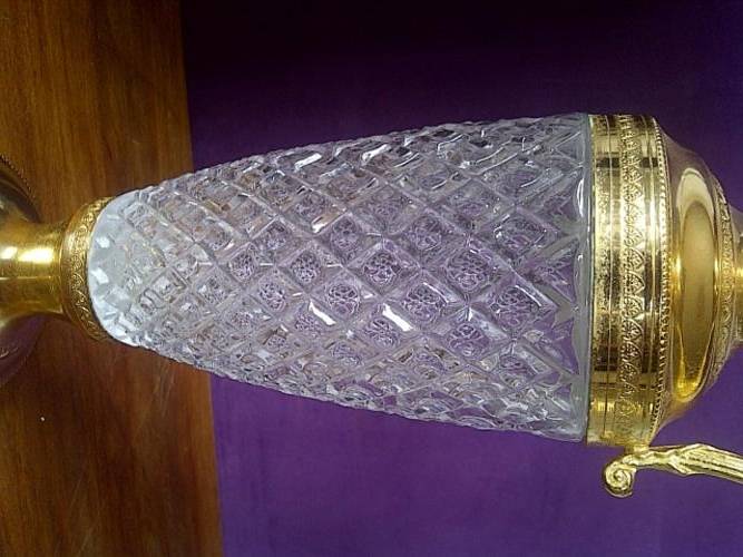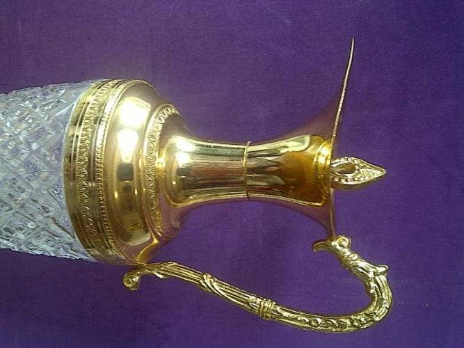 True Italian styled claret jug decanter, ornately plated in a gold finish and cut glass body. In excellent condition with original cork stopper.