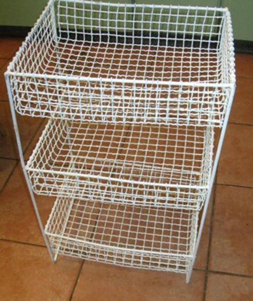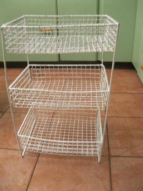 You are bidding on a Vintage Metal Mesh 3 tier vegetable basket, that stands 62cm high & the baskets are 38x 29cm.