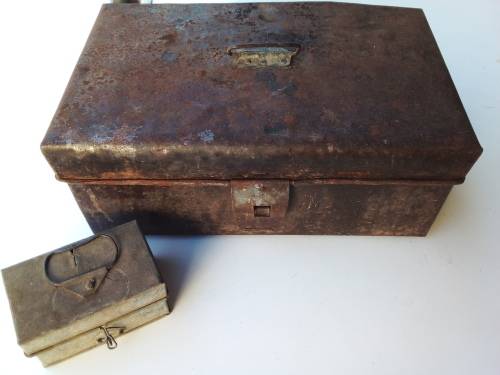 Vintage document trommel. size = 40x25x13 cm and Trinket box. size = 12x8x7 cm combination, hand made from metal / 1930.