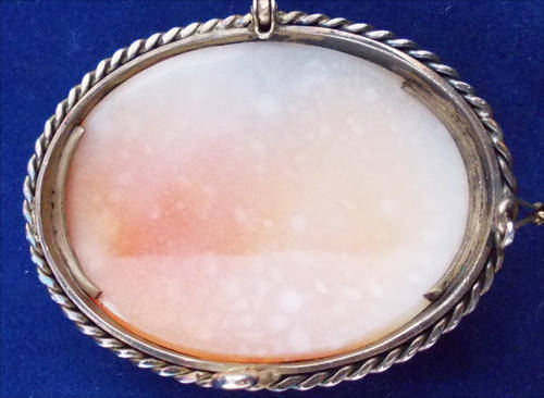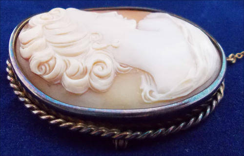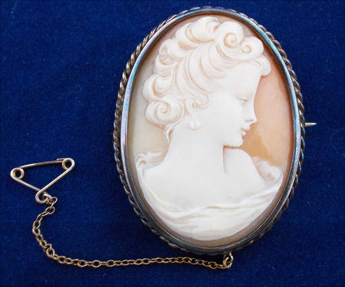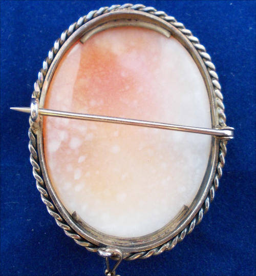 Large Silver and Conch Shell Cameo Brooch With Gold Safety Chain.
