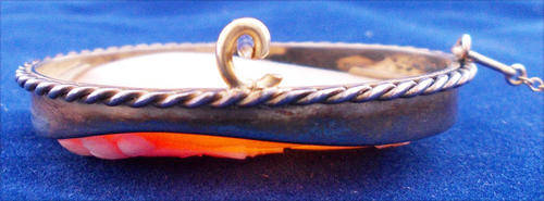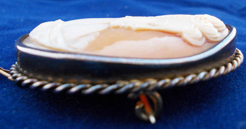 Vintage Shell Cameo Brooch with frame shaped like a twisting rope. The frame is silver with a gold plating and a 9k gold safety chain. The frame holds the carved conch shell with an image of a beautiful young Victorian woman surrounded with a peach background. A very special quality piece!