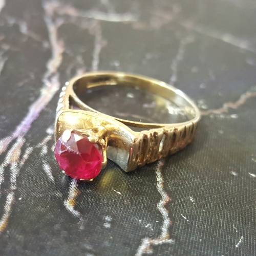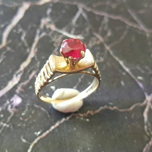 A stunning Item. According to the seller this ring is set with a genuine Ruby. I am however selling it is as a synthetic Ruby. Sadly my knowledge on semi precious stones is not good enough to authenticate. Nevertheless an amazing Vintage ring. The workmanship is absolutely amazing. Offers welcome, Ring size approx R.