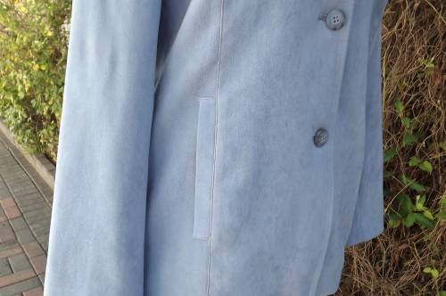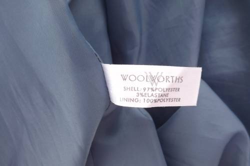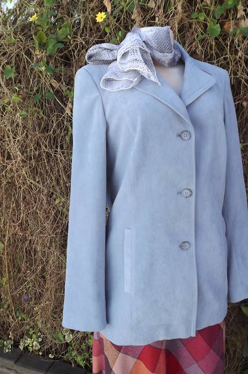 Styled light steelblue lined jacket.Size 34/10 by Woolworths. In soft polyester fabric.Two in seam vertical pockets on front.Button down front.Suitable for casual or office wear.As new
