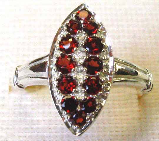This design ring is hand set with  12  pieces  of  2.00 mm  round faceted cut garnets, total carat weight 0.72 ct.  - nice red- brown color gemstones in sterling silver.The ring- size is " N   "  ,Top of the ring is 17.00 x 9.00 mm and  weight 2.43 grams and the design of the ring is superb- marquise  style and very affordable price. New ring.The detailing on this ring is absolutely gorgeous,   the image is the original.